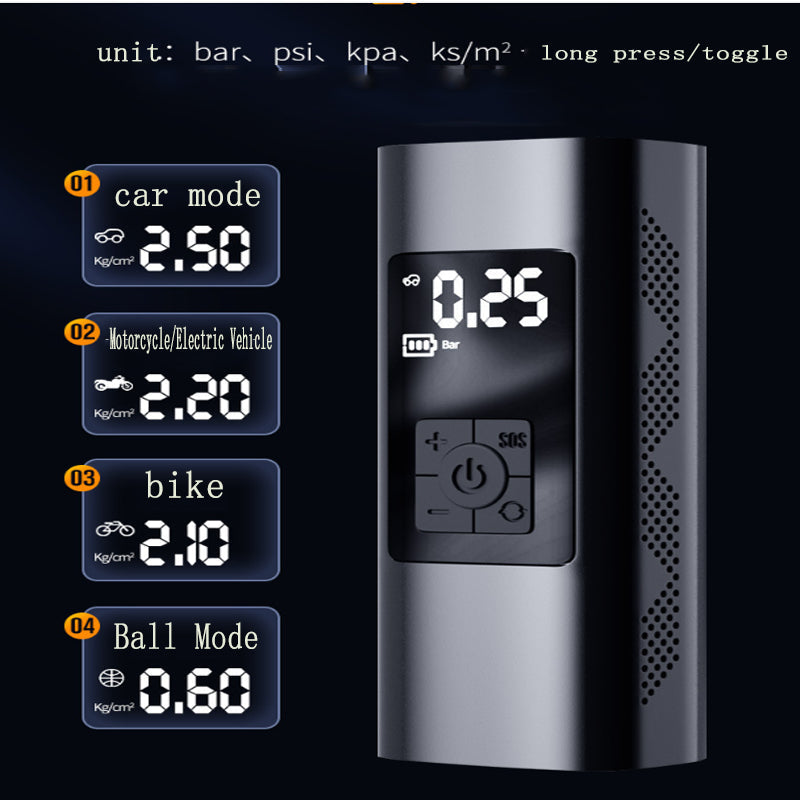 Le gonfleur de pneu à compresseur d'air portable est équipé d'une puce de haute précision améliorée, garantissant une mesure précise de la pression des pneus. Le grand écran LCD double affiche à la fois la valeur de pression en temps réel et la valeur prédéfinie, pratique pour la surveillance et le fonctionnement. Arrêt automatique lorsque la valeur prédéfinie est atteinte, aucun risque de surgonflage.