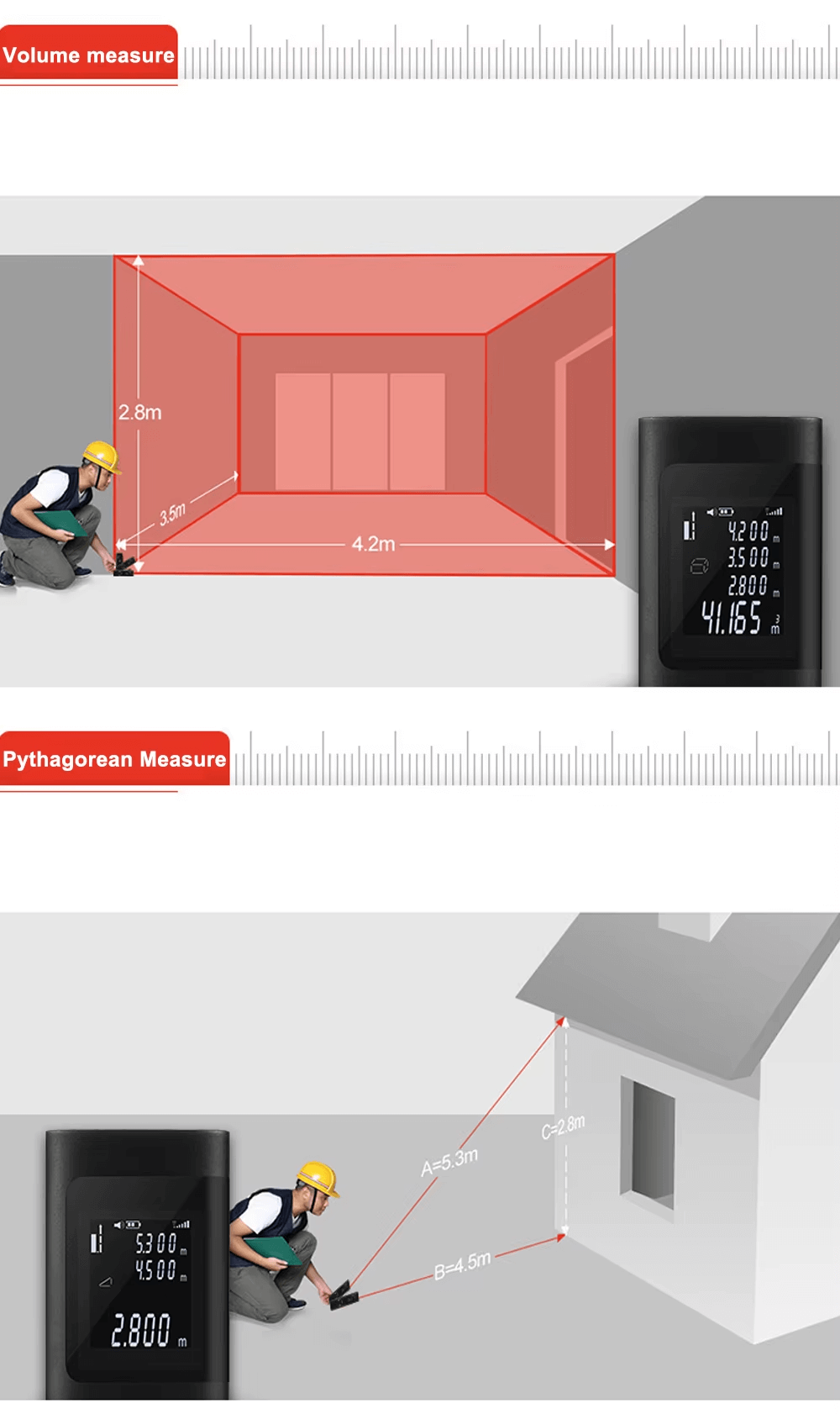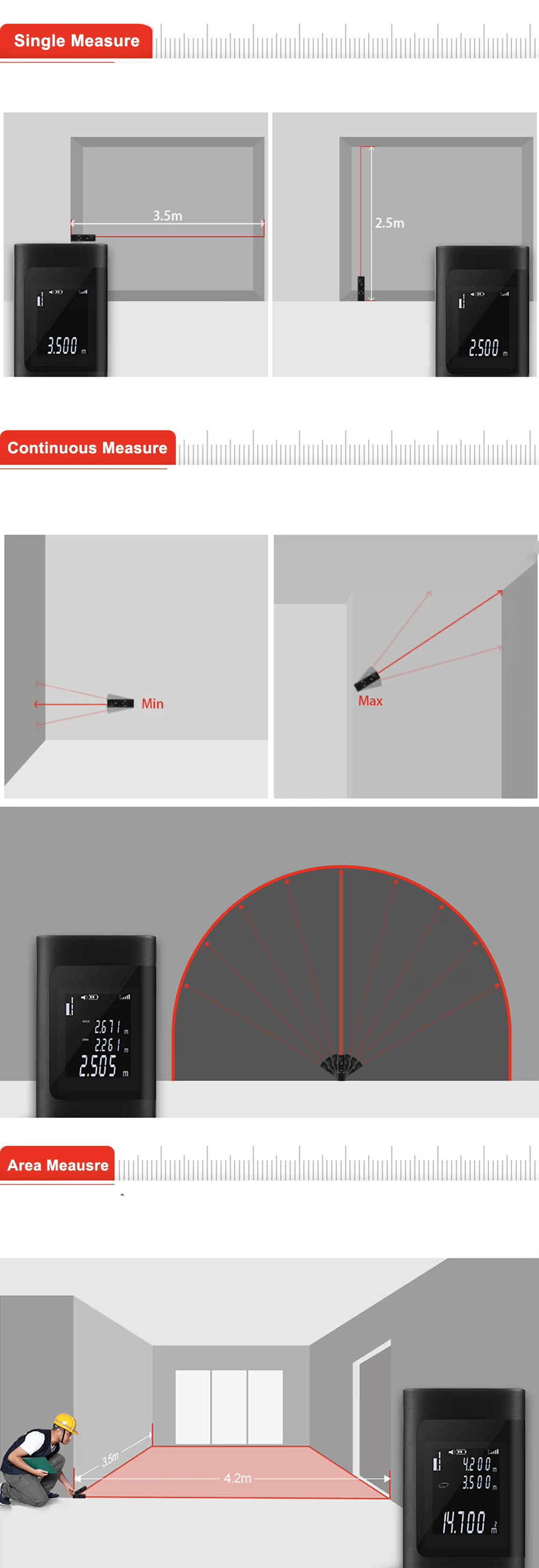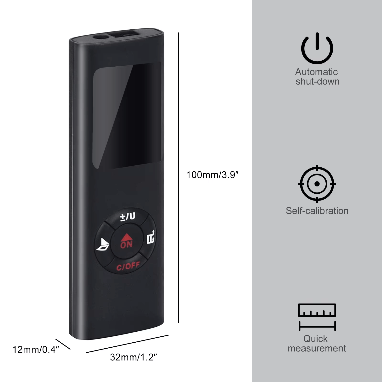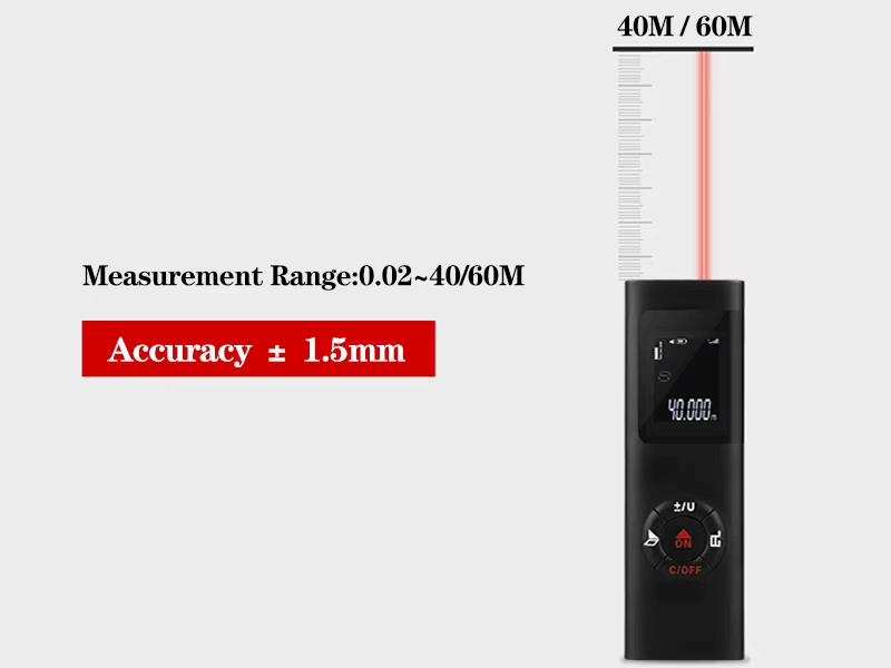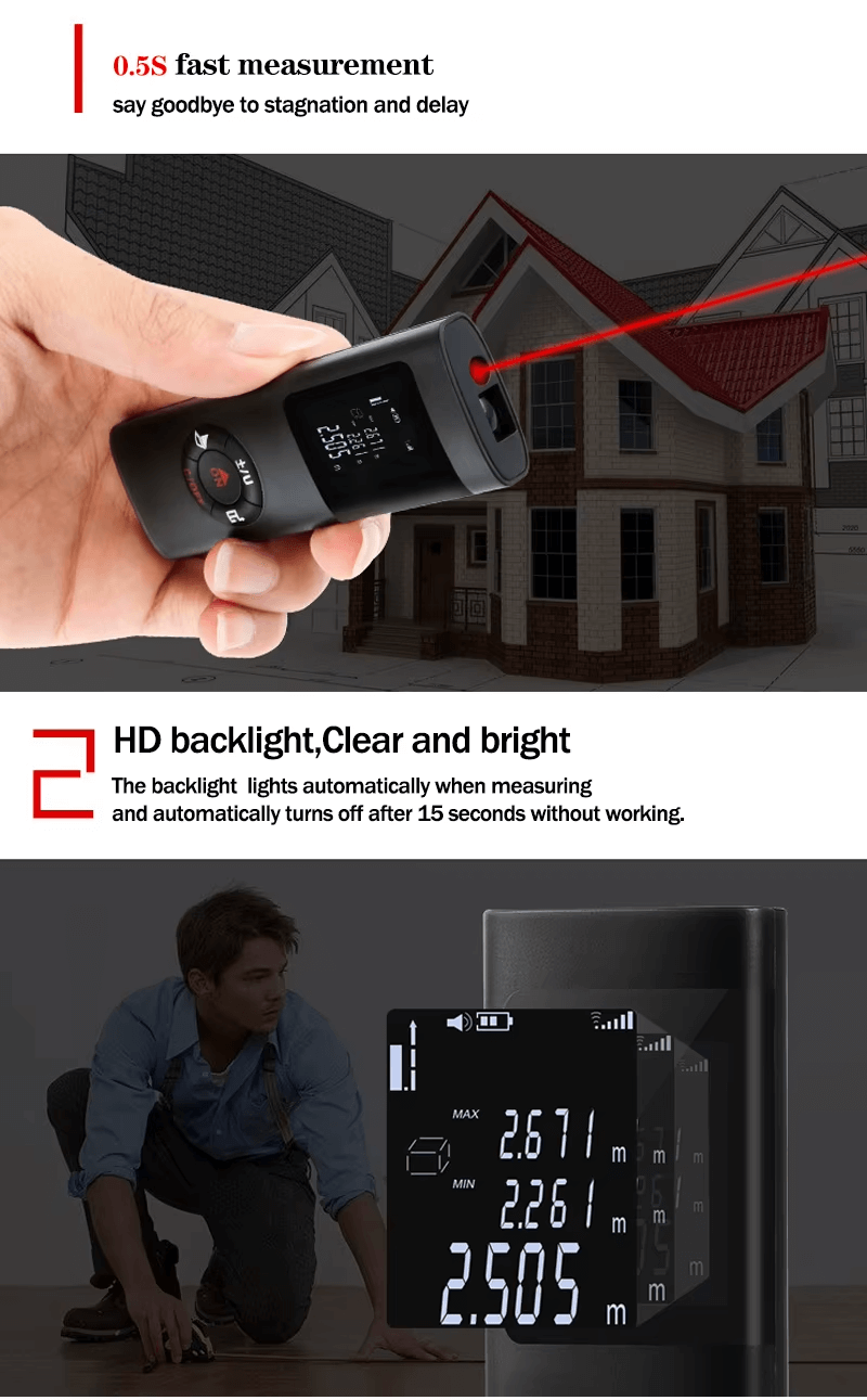 Ce télémètre précis peut être utilisé dans la maison, la construction, l'industrie, le résidentiel, l'entrepôt et plus encore. Il est alimenté par une batterie au lithium à économie d'énergie et respectueuse de l'environnement, qui vous permet de mesurer des distances 2000 fois lorsqu'elle est complètement chargée. L'appareil de mesure vous fournit 3 unités différentes, y compris les mètres, les pouces et les pieds, et vous pouvez choisir l'unité appropriée pour une mesure rapide.